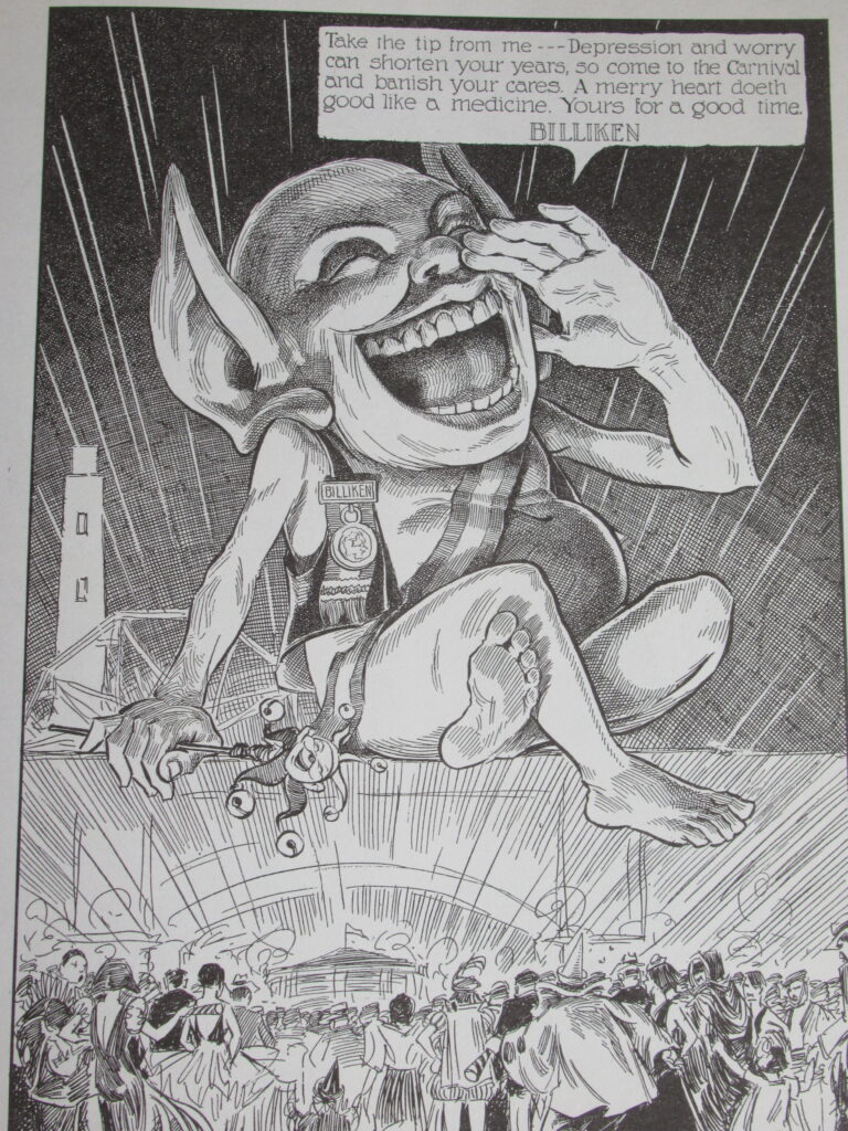 当時の週刊誌「フィリピンズ・フリー・プレス The Philippines Free Press」(1933年9月4日)に掲載された漫画*を見ると、ビリケンが会場入口で「わたしからの贈り物だ。憂鬱や心配はお前たちの命を縮めるよ。だからカーニバルにおいで。そして、心配事を忘れなさい。楽しい気分になるのが何よりの薬。楽しめ諸君!」と呼びこみをやっています。